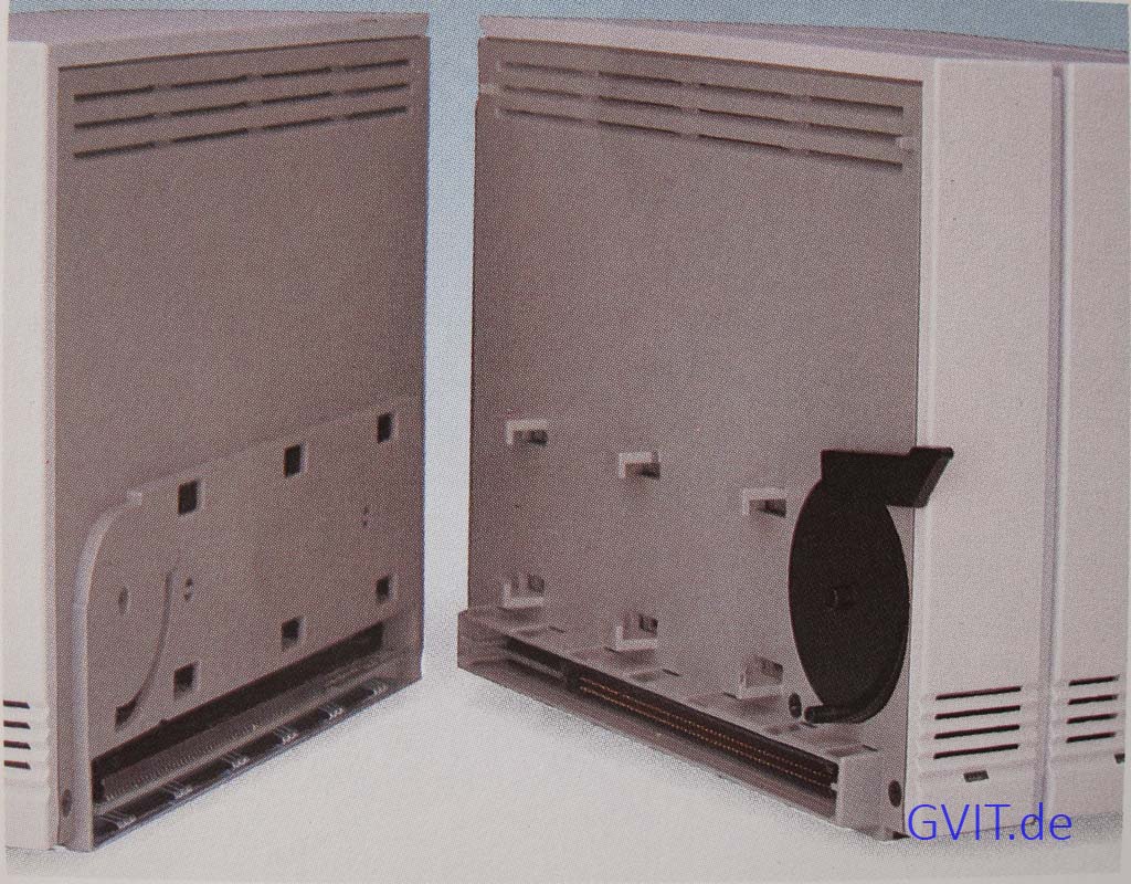 Bildschirm, Tastatur und Rechnermodul bilden somit die Basis-Konfiguration eines multifunktionalen Arbeitsplatzes, der sich - entsprechend der jeweiligen Anforderungen - um weitere Module ergänzen läßt. Der besondere Clou ist dabei die Technik, mit der sich diese Ergänzungen durchführen lassen: Das Rechner-Modul (Abb.4) hat auf der rechten Seite eine offene Steckerleiste mit 120 Anschlüssen, an die das jeweils nächste Modul einfach angesteckt wird: völlig ohne Kabel (X-Bus)! Der Verschlussmechanismus sorgt für eine einwandfreie und funktionelle Verbindung zwischen Buchse und Stecker.