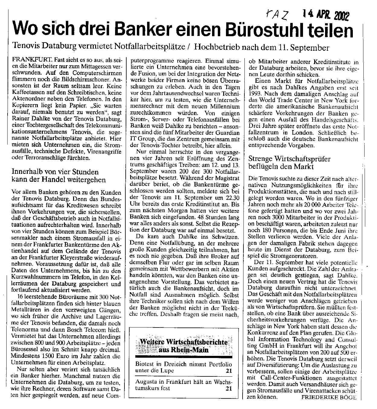 Zum 1.1.2001 gründet das Frankfurter Telekommunikationsunternehmen Tenovis die Tenovis-Databurg. In dieser Gesellschaft bündelt das Unternehmen alle Aktivitäten in den Bereichen Telehousing, Telehosting und Business Recovery.