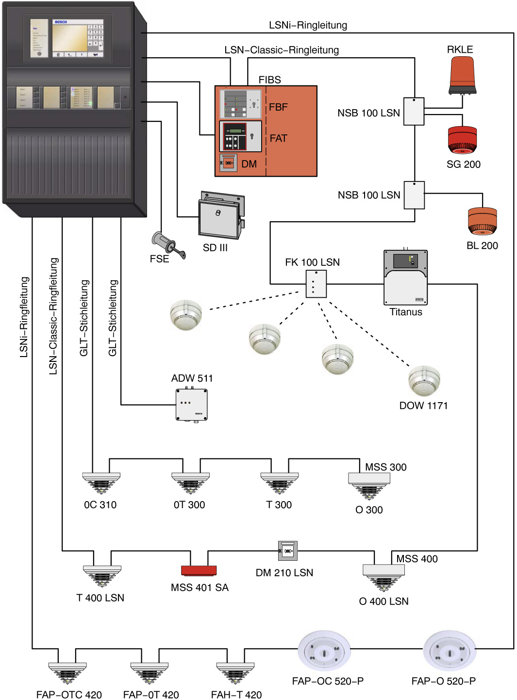 Die Übersicht zeigt das Beispiel einer BMA mit der FPA 5000 als Zentrale
