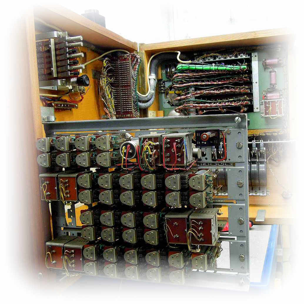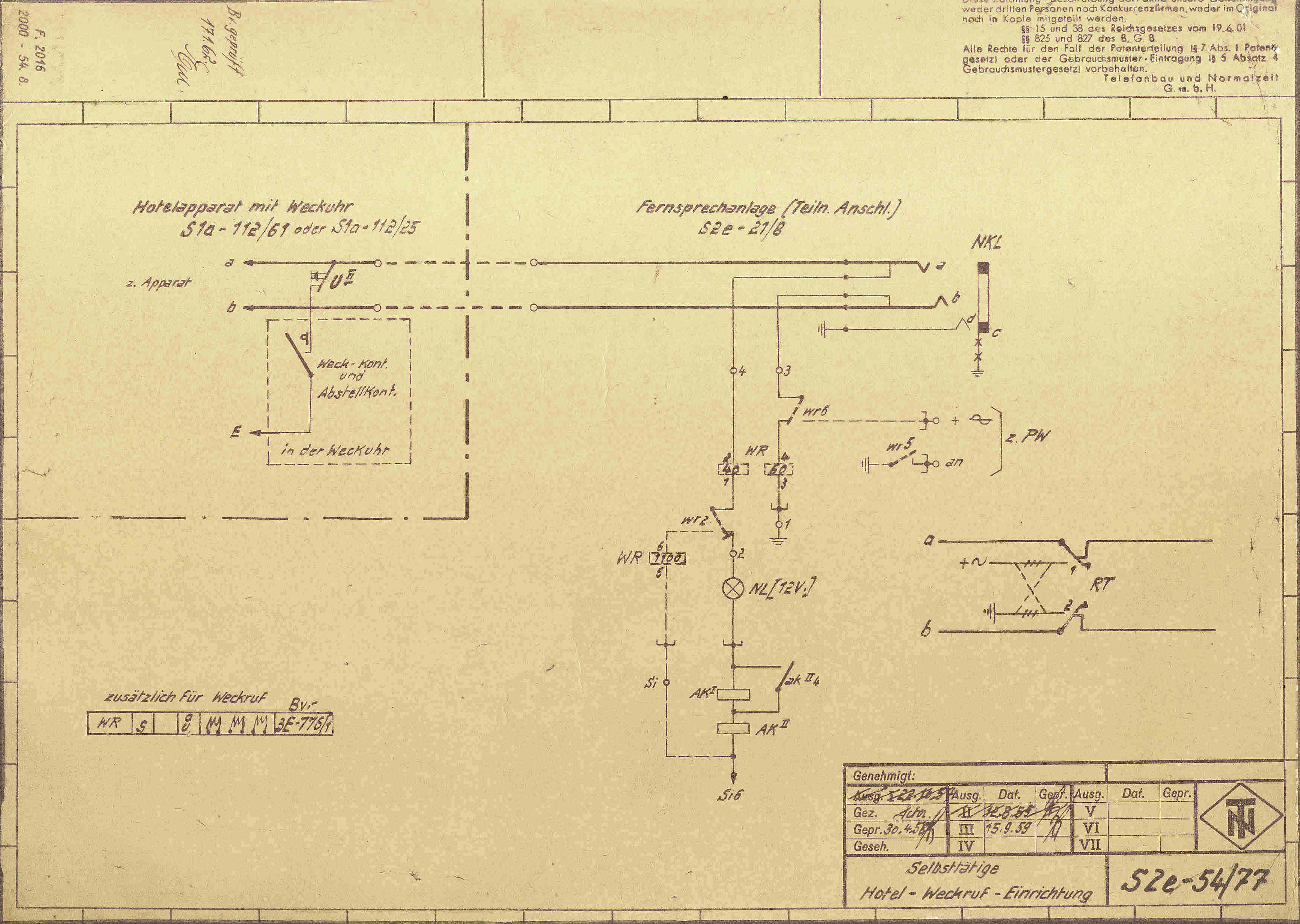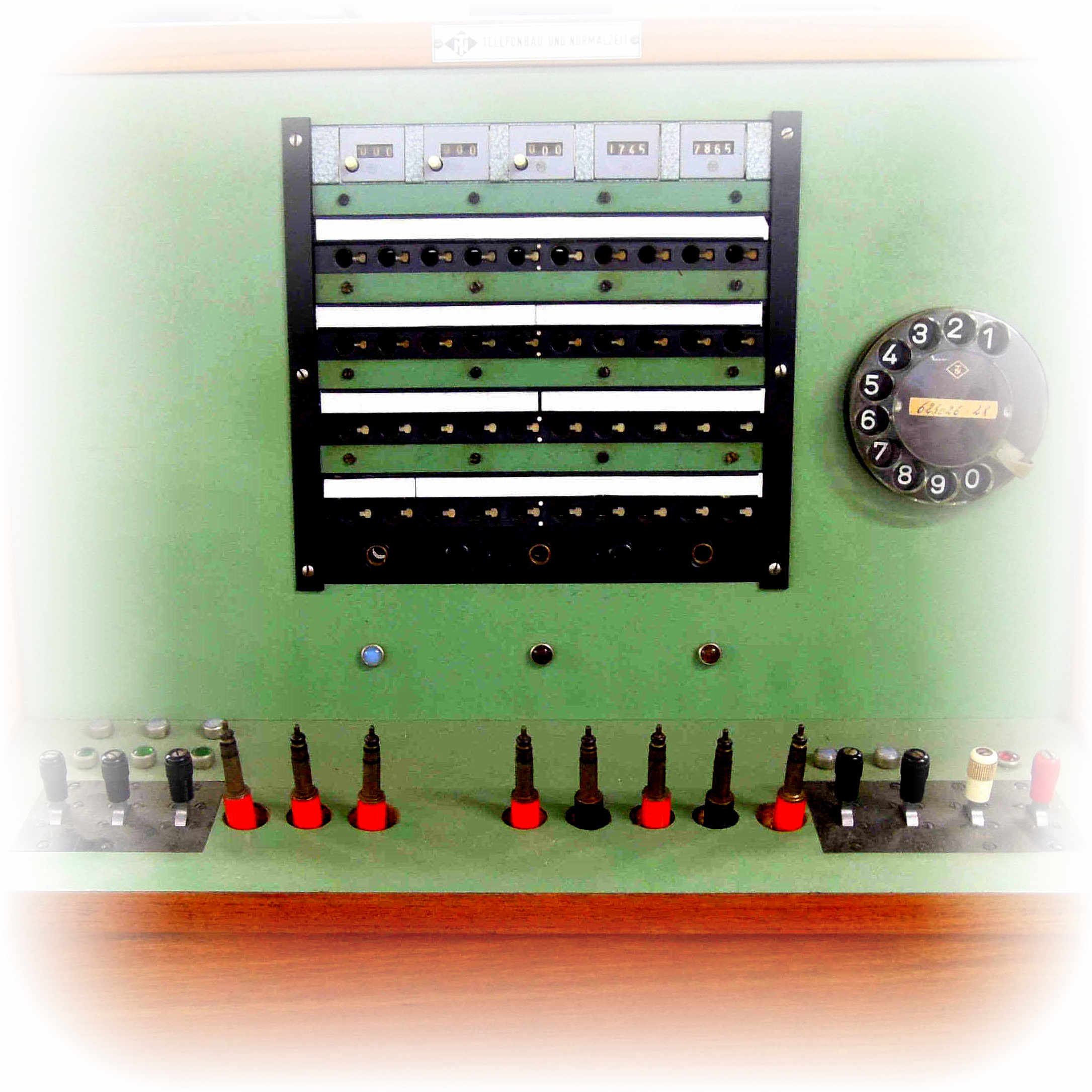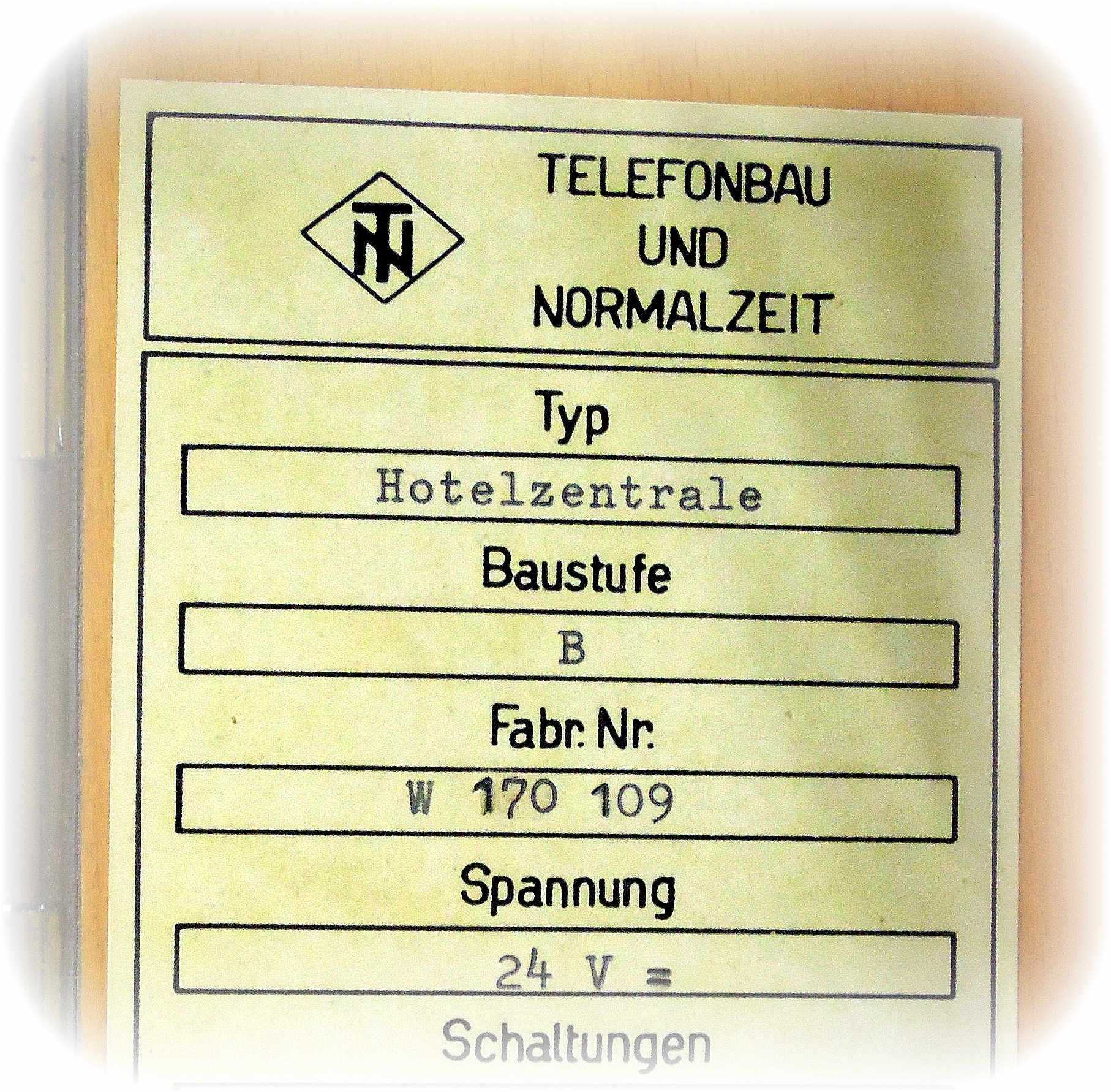 | Schnurvermittlungstechnik Hotelzentrale nach Schaltung S2e-21/8 Nebenstellenanlage mit Glühlampen-Anrufzeichen für 40 Nebenstellen ZB- (Zentralbatteriebetrieb) / W- (Wähl) Betrieb 3 Amtsleitungen (Einschnursystem) 2 Innenverbindungs-Schnurpaare 1 Benachrichtigungsstöpsel Abfrage- und Vermittlungsschnüre mit Aufrollvorrichtung Vermittlungsfunktionen speziell für Hotel-Anlagen ☞☎) ausgelegt Keine Mithörmöglichkeit Selbsttätige Hotel-Weckruf-Einrichtung Nachtschaltung Nebenstellenruf mit Relais-Polwechsler Amtsleitungen mit eingebauten 16-kHz-Gebührenimpulszählern Wecker auf Langsamschläger (25 Hz) umgebaut Kein Haken für Handapparat |