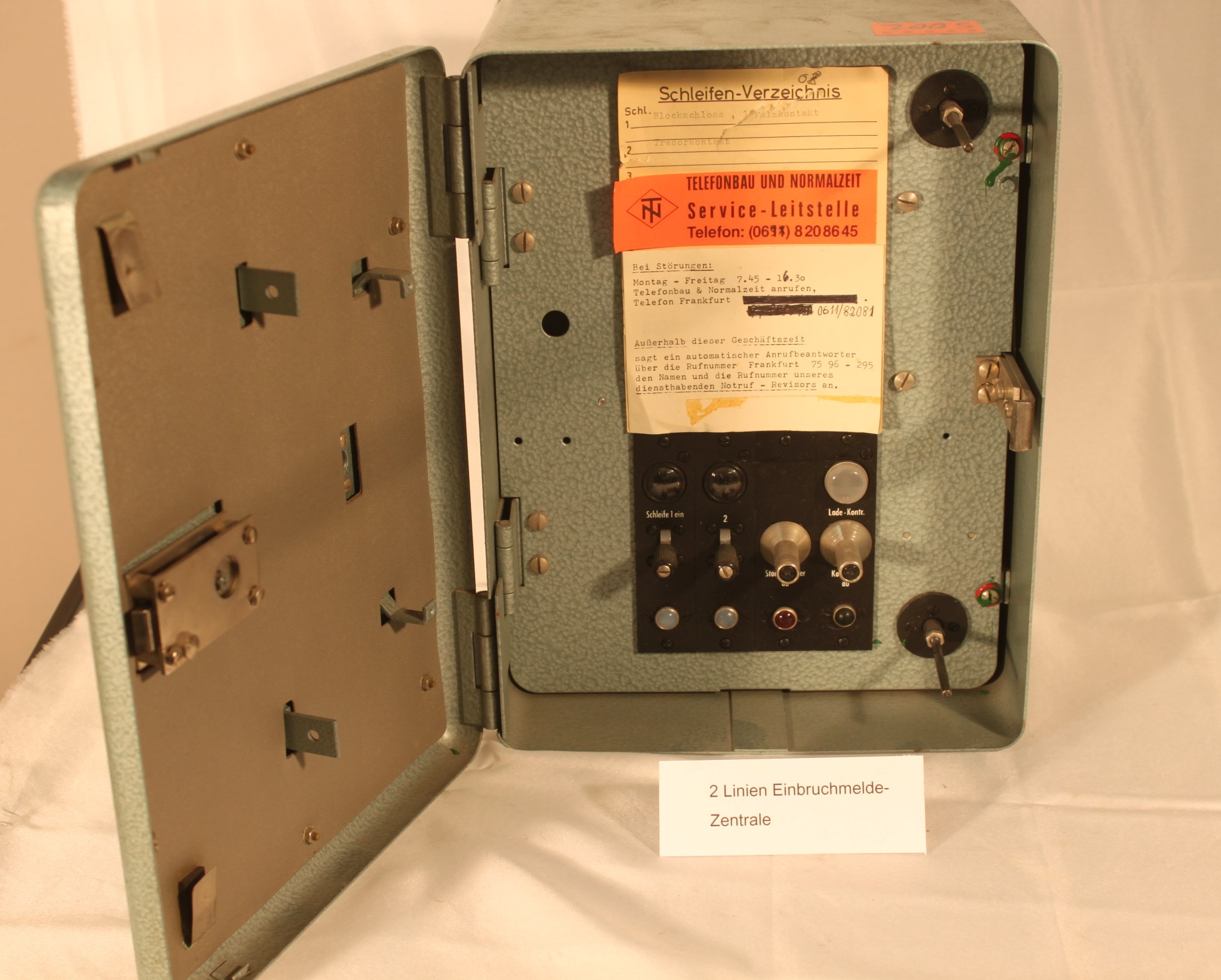Zentrale bei offener Außen-Tür. Bitte beachten Sie auch die beiden diagonal angordneten Sicherungskontakte (unten links und oben rechts) als Türkontakt und zur Überwachung der Frontglasscheibe (bei Öffnen der Tür oder Zerstörung /Entfernung der Scheibe wird je nach Zustand der Anlage Internalarm oder Externalarm ausgelöst.)