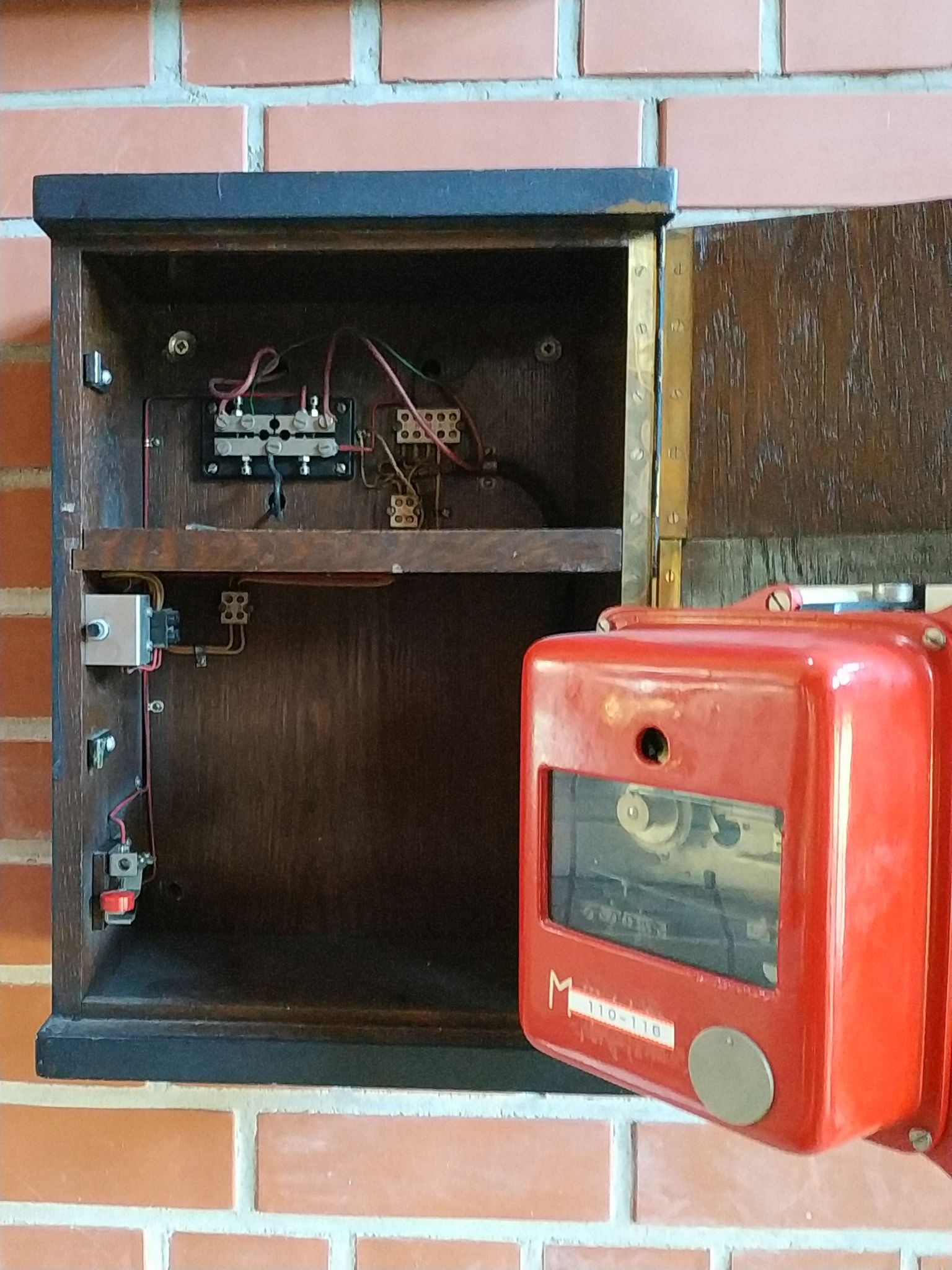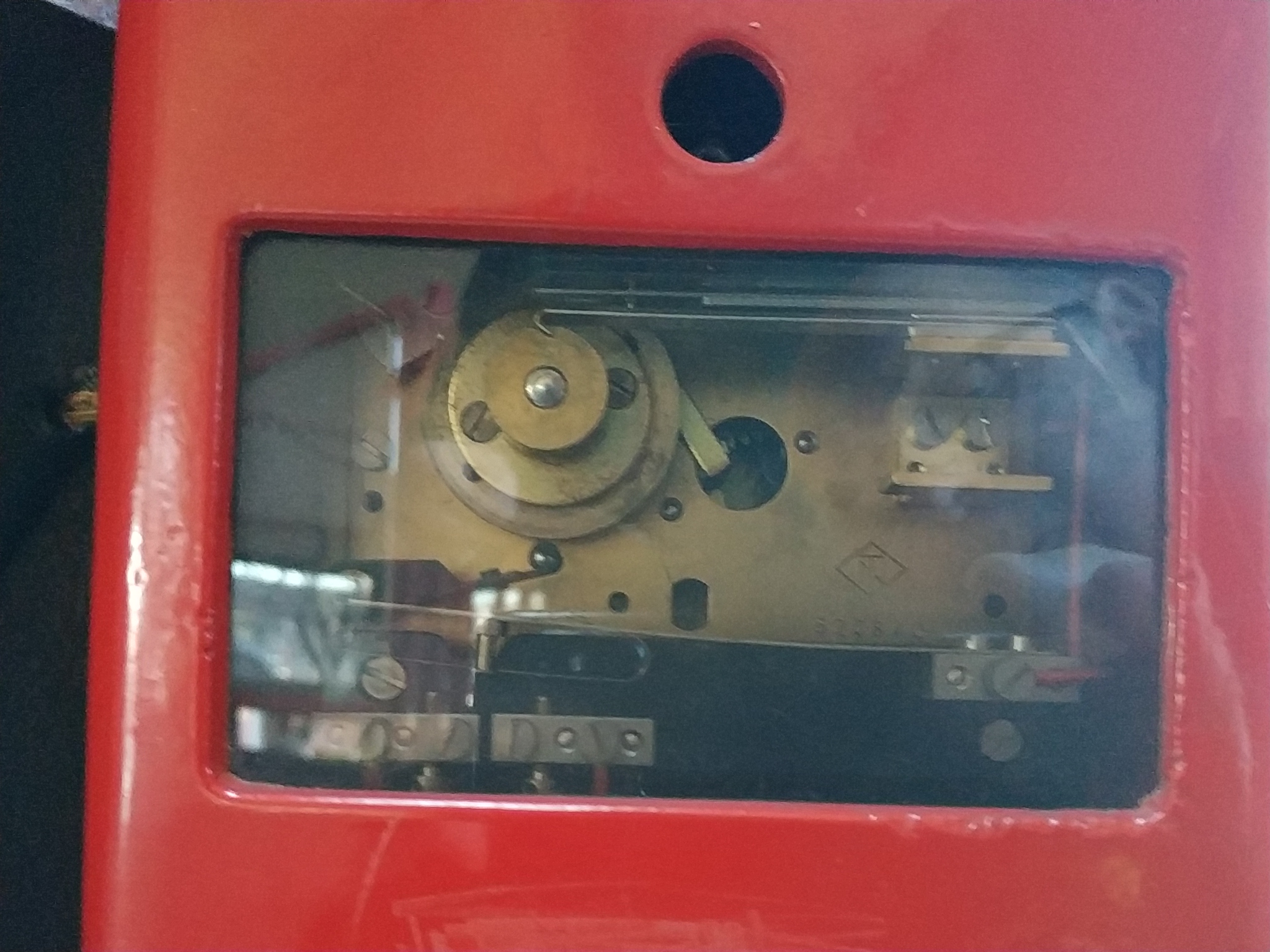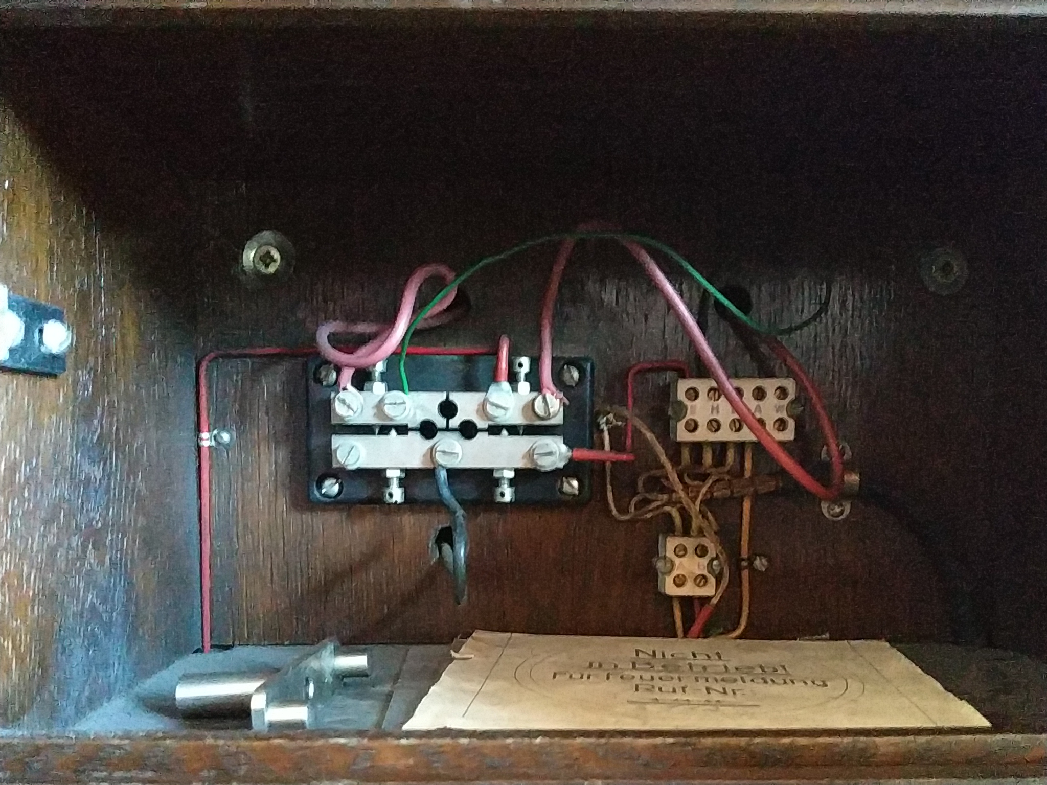 Noch eine Information zum Türkontakt (in der oberen Tür) und warum ein Telefonhörer gebraucht wurde:bei Öffnen der oberen Tür wurde mit dem Türkontakt bei der Empfangszentrale ein Revisionswunsch erzeugt. Nach Sprachverbindung über den Hörer und Identifizierung des Revisors wurde der Hauptmelder dann von der Empfangszentrale in Revision genommen. Wird anschließend bei Prüfarbeiten Vorort ein Feueralarm ausgelöst, wurde aus ihm ein sog. "Revisionsalarm", der natürlich keinen Feuerwehreinsatz zur Folge hatte. Nach Beendigung der Prüfarbeiten wurde der Hauptmelder dann vom Revisor telefonisch "Klar gemeldet" und bei der Empfangszentrale wieder "Scharfgeschaltet". Bei anderen HM-Ausführungen, z.B. bei dem folgenden Foto Modell Frankfurt, gab es keinen eingebauten Hörer, sondern er besaß einen Handapparate-Klinkenstecker, so dass der Revisor mit seinem mitgeführten Hörer telefonieren konnte. Diese Methode wurde später Standard (auch bei Notruf-HM).