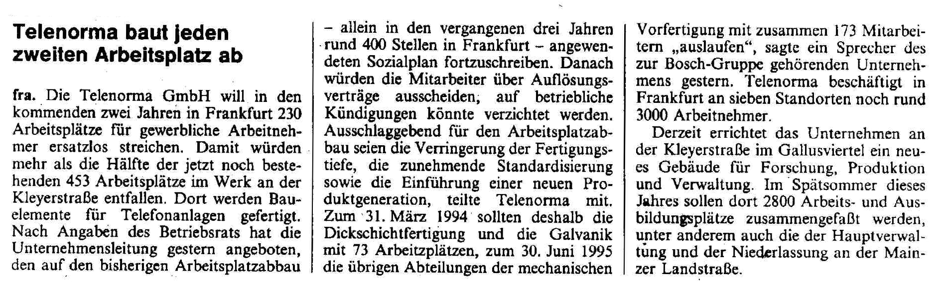 1995 Bosch kündigt Stellenabbau auch bei Telenorma an