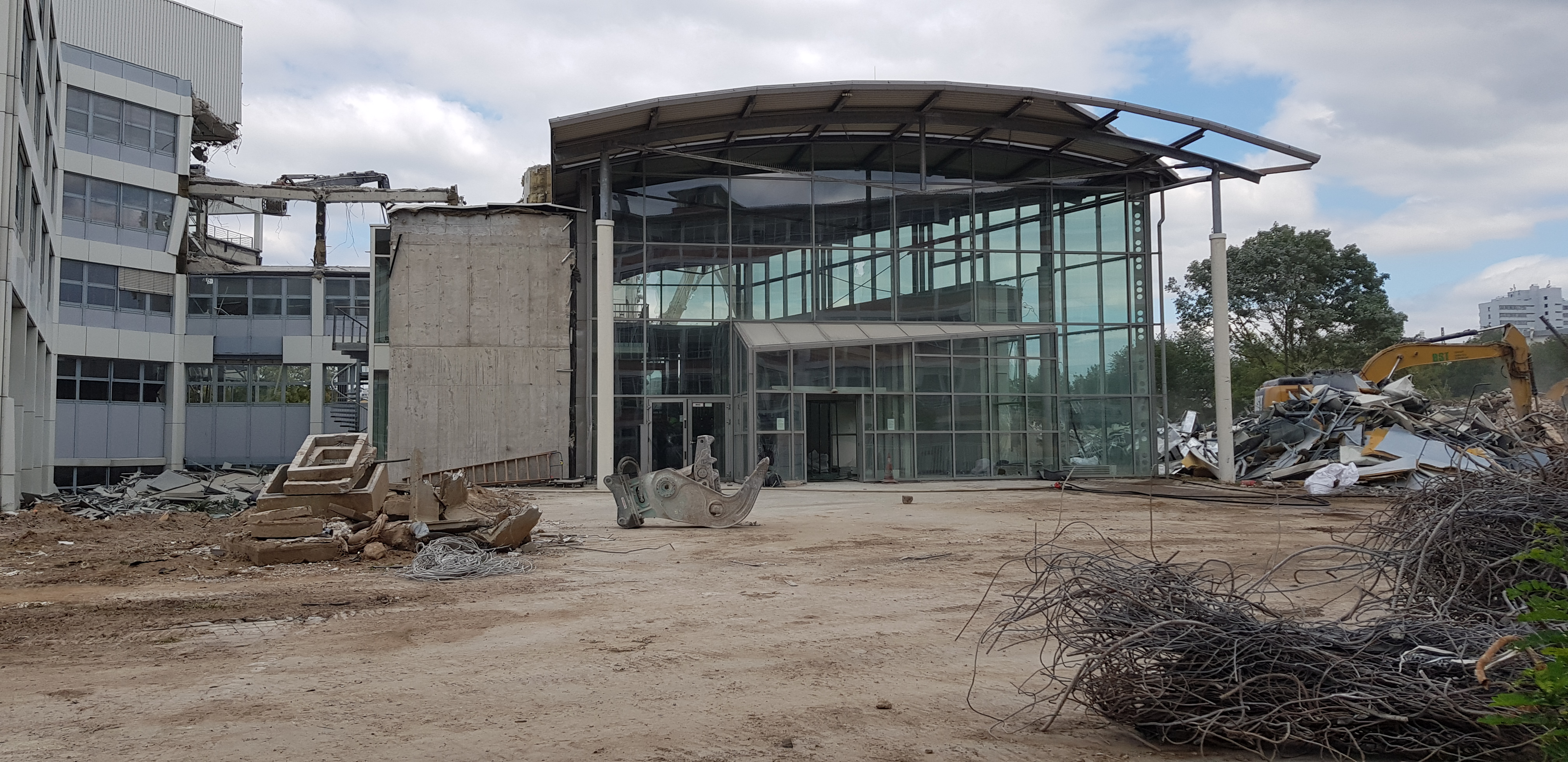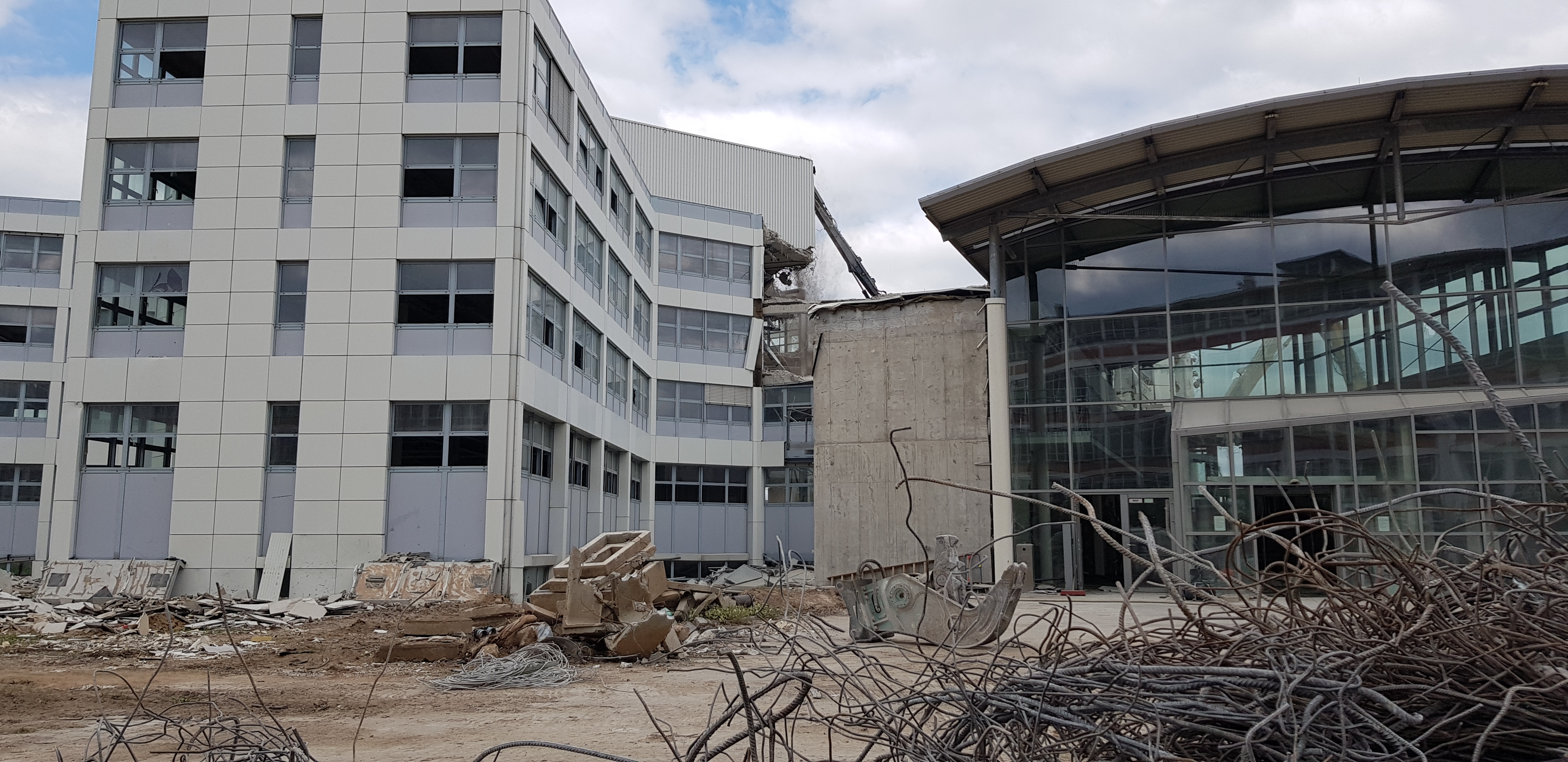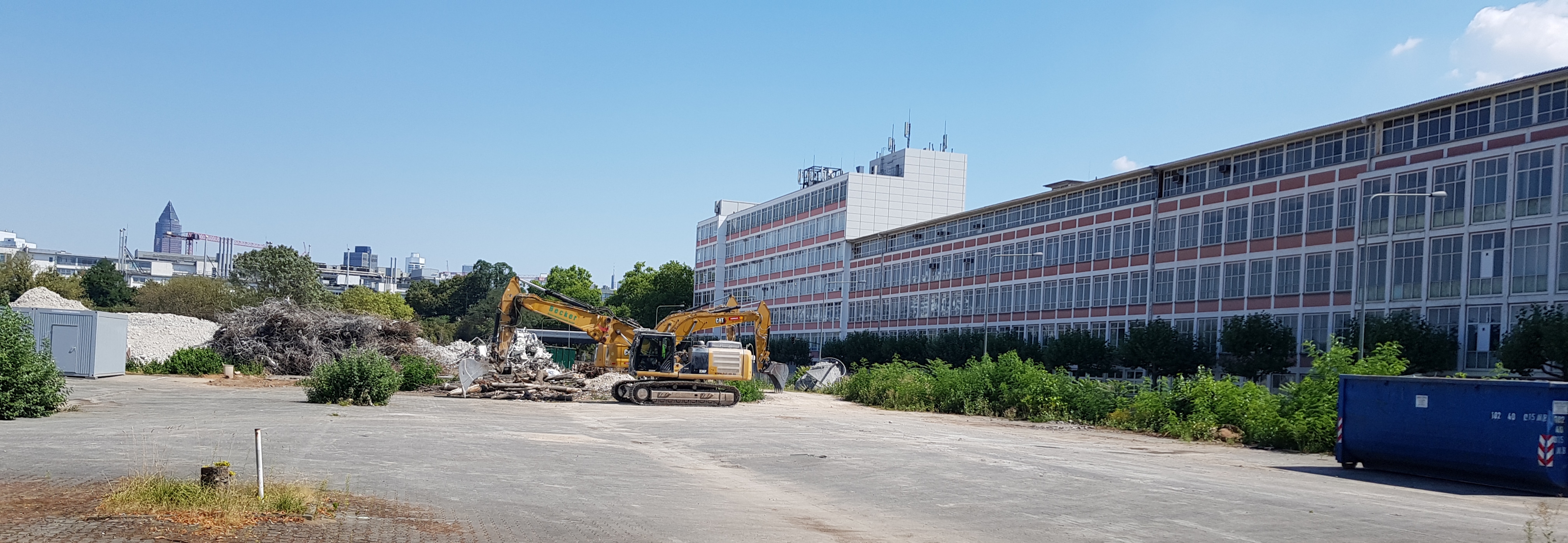 Auf dem westlich der Bahnlinie Frankfurt-Höchst liegenden Teil des ehemaligen TEVES-Geländes werden die seit 2013 leerstehenden TN/Tenovis/AVAYA Gebäude und Sternbauten links und rechts der Rebstöcker Straße zugunsten eines neuen Wohnquartiers „Westville“ abgebrochen. Auf der Internetseite https://baustelle-westville.de/ ist ein Blog realisiert, über den in den Bildergalerien der einzelnen Beiträgen die Fotos vom Abriss gepostet werden. Hier einige Fotos daraus mit freundlicher Genehmigung von :