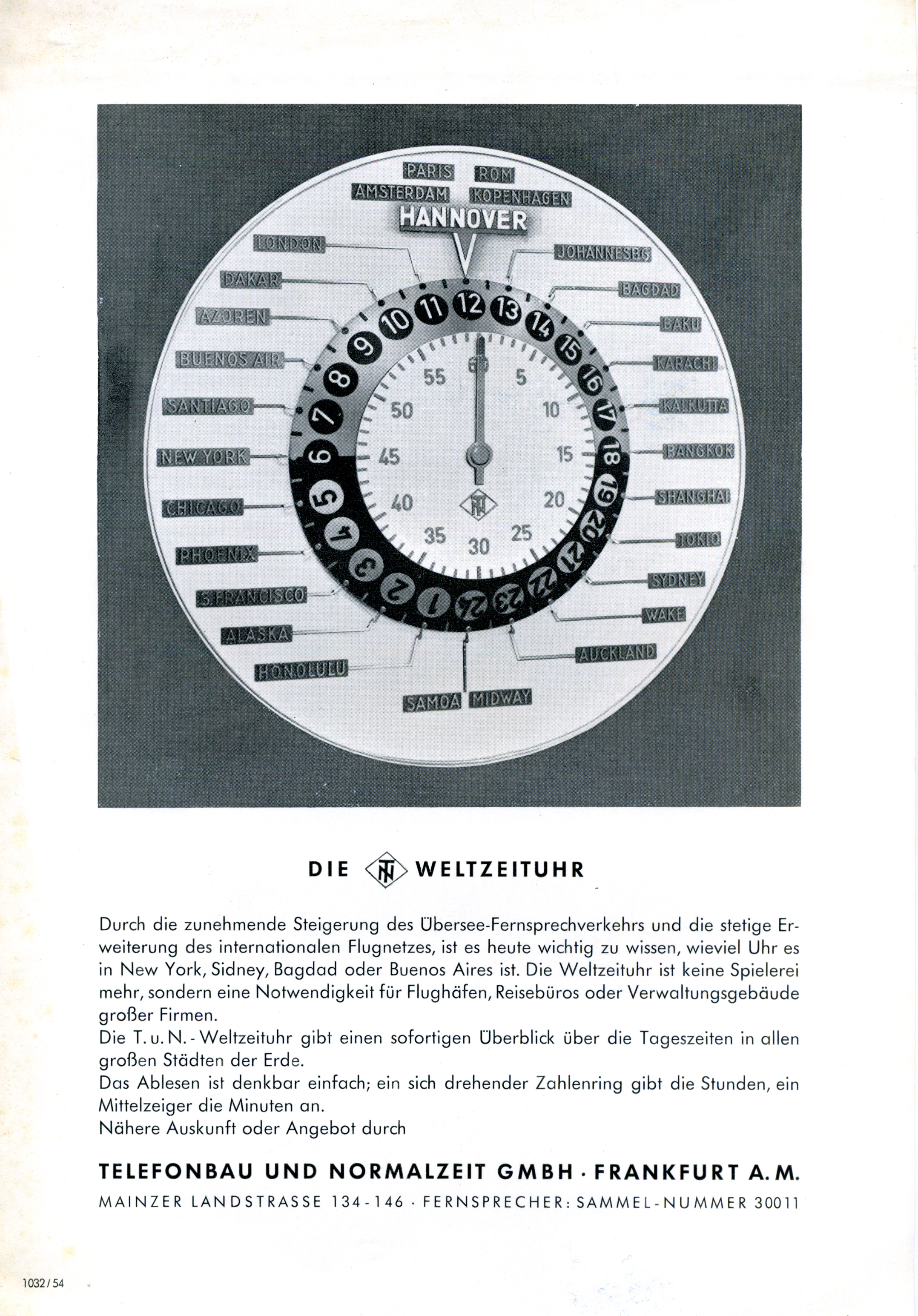 Bei der ersten TN-Weltzeituhr dreht sich um einen Minutenzeiger in der Mitte, der Stundenzeiger als Zahlenring, und zeigte alle wichtigen Städte in 24 Zeitzonen der Erde an.