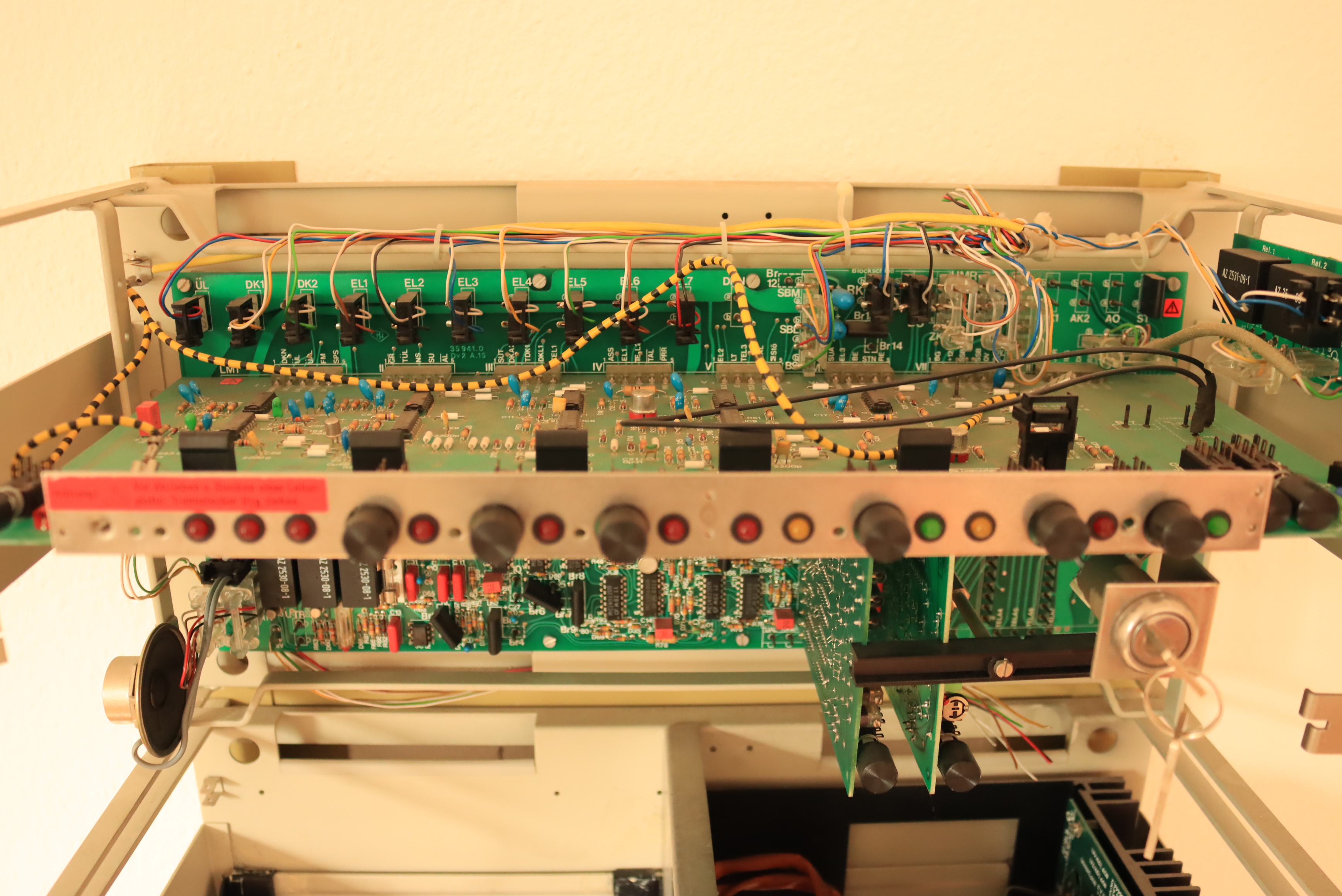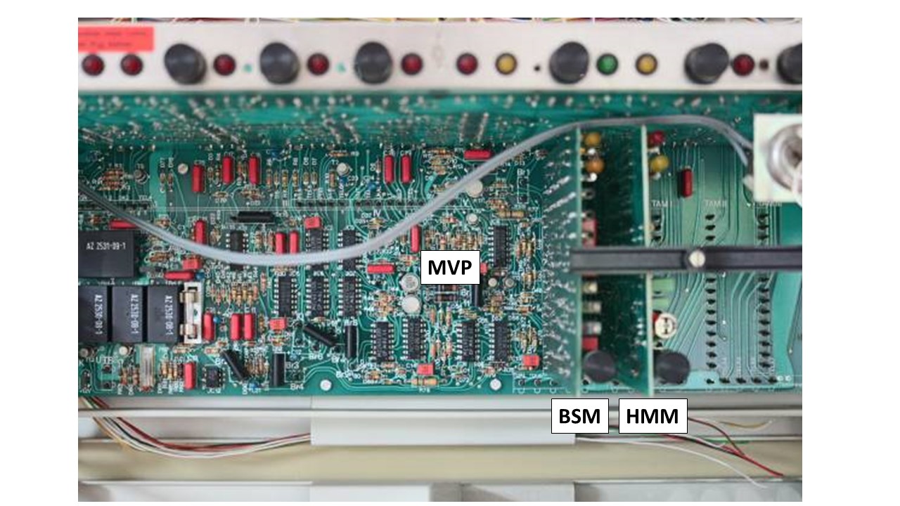 Hintere senkrechte LP ist die Modulverbinderplatte, rechts daraufgesteckt ist das Blockschloss-Modul BSM, rechts daneben das Hauptmelder-Modul HMM